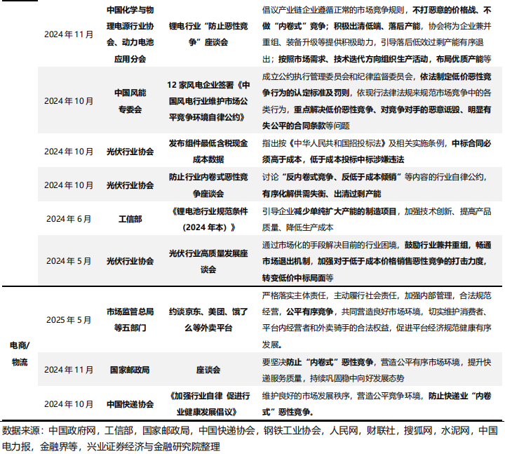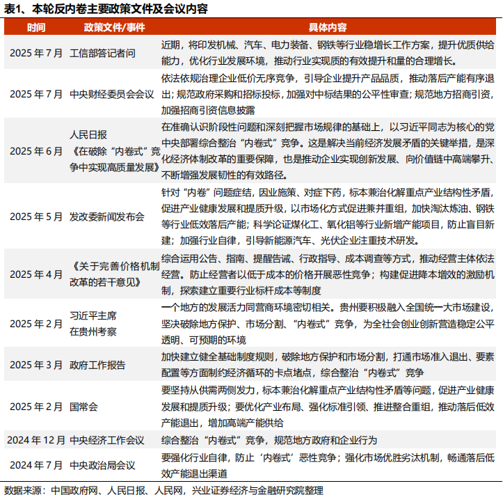 二季度随着国务院办公厅、发改委、中央财经委员会等中央机构接连表态,反内卷推进节奏开始加速。4月国务院办公厅发布《关于完善价格机制改革的若干意见》,5月发改委再次提及整治“内卷式”竞争,7月中央财经委员会第六次会议再提依法依规治理企业低价无序竞争,推动落后产能有序退出。当前各行业整治“内卷式竞争”也开始有了实质性动作。