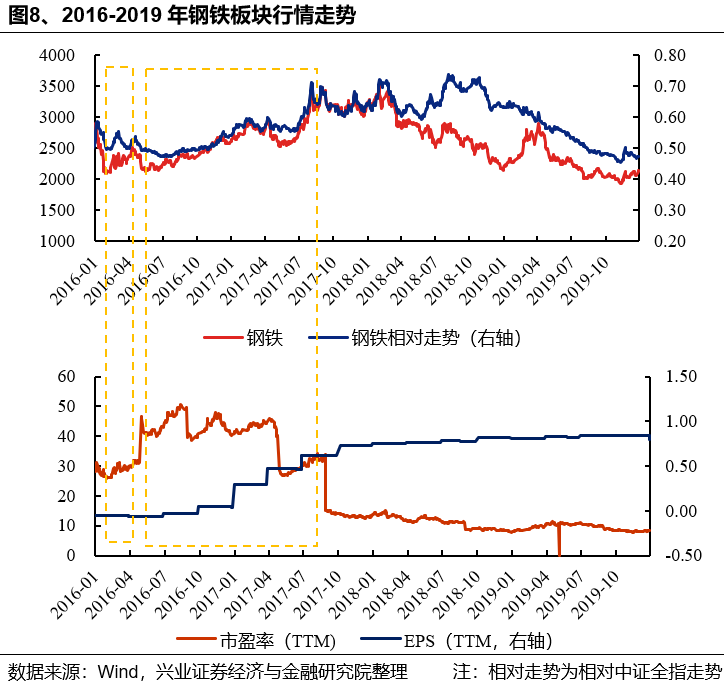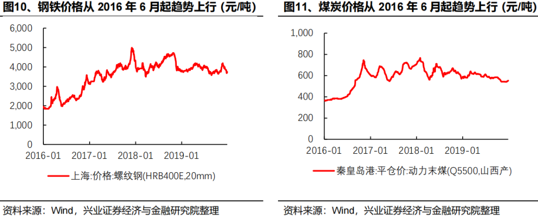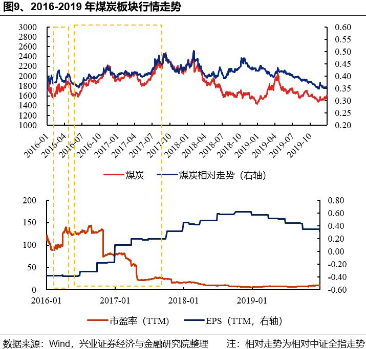 从行情节奏上来看,2016年2月行业文件下发后,改革利好预期下板块迎来首轮上涨。鉴于供给侧仍在磨底期,基本面没有明显变化,涨幅贡献主要来自于估值修复。而行情真正的拐点出现在2016年6月钢铁、煤炭商品价格确认进入上行通道,行业基本面发生改善之后,钢铁、煤炭板块走出一轮趋势性行情。