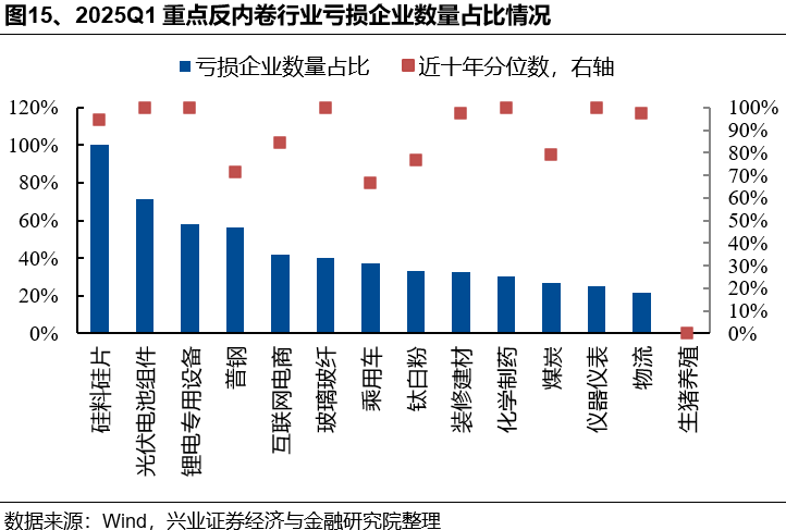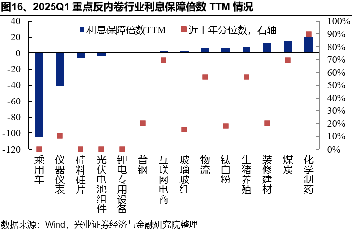 综合【亏损企业数量占比】和【利息保障倍数】来看行业内企业参与反内卷的迫切性:如若业内绝大多数公司利润转负,且利润难以覆盖利息支出,或指向企业当下配合反内卷的意愿较高,典型行业包括新能源链、普钢、玻璃玻纤、钛白粉、装修建材、乘用车等。