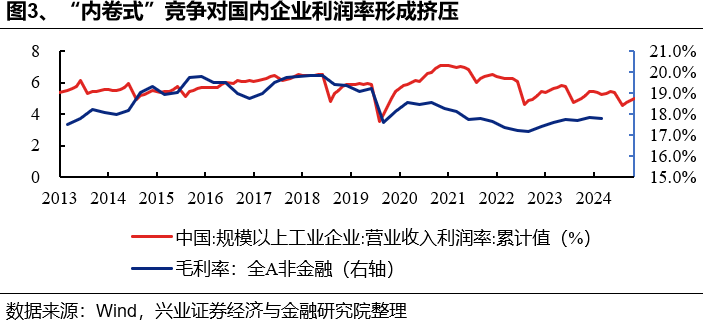 供强需弱下的“内卷式”竞争挤压了企业的利润空间。我国工业产能利用率自2021H2以来震荡走低,指向供给侧相对富余。规模以上工业企业营业利润率在过去三年中趋势性下行,来到了近十年来的相对低位,非金融上市公司的毛利率数据也反映了同样的问题。