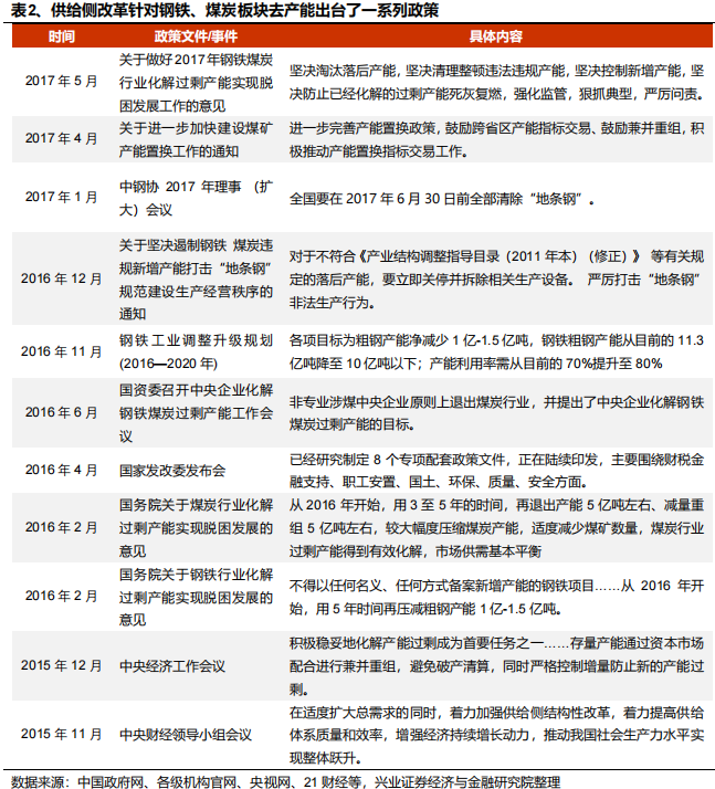 钢铁、煤炭供给侧去产能可以取得效果的核心原因之一是行政性去产能政策决心大:1)顶层文件明确煤炭钢铁2016-2018年历年去产能目标,并针对“地条钢”、存在安全问题的小煤矿等落后产能下达强制性退出行政指令。2)去产能目标被拆分落实到各省严格执行,由发改委等部委作为召集人牵头建立部际联席会议制度,统筹推进化解过剩产能各项工作,督促钢铁、煤炭去产能进度。