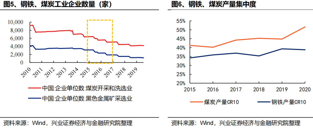 其次,央国企龙头主导推进了大量行业内兼并重组,使得行业集中度明显提升,竞争格局明显改善。2015年末钢铁/煤炭行业企业数量分别为3128家/6430家,到2018年初则降至1500/4000余家,这带来行业集中度持续提升,2017年TOP10钢铁/煤炭产量占比分别升至36.9%/44.2%。