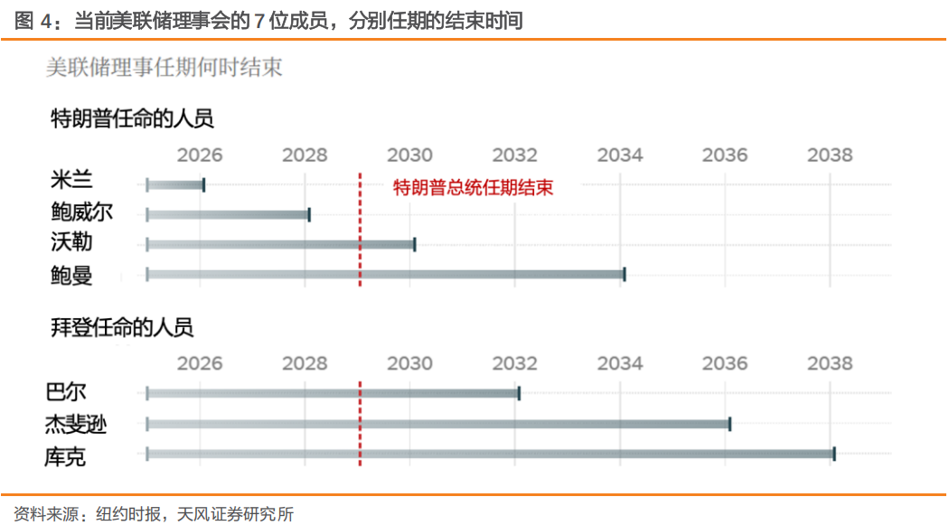鲍威尔卸任主席后,预计大概率辞去理事职务离开美联储;但也有卸任主席后继续担任美联储理事的历史先例。当前理事会7名理事中,除了米兰和鲍威尔之外,其他理事的任期均持续到2028年以后,特朗普难以干涉。